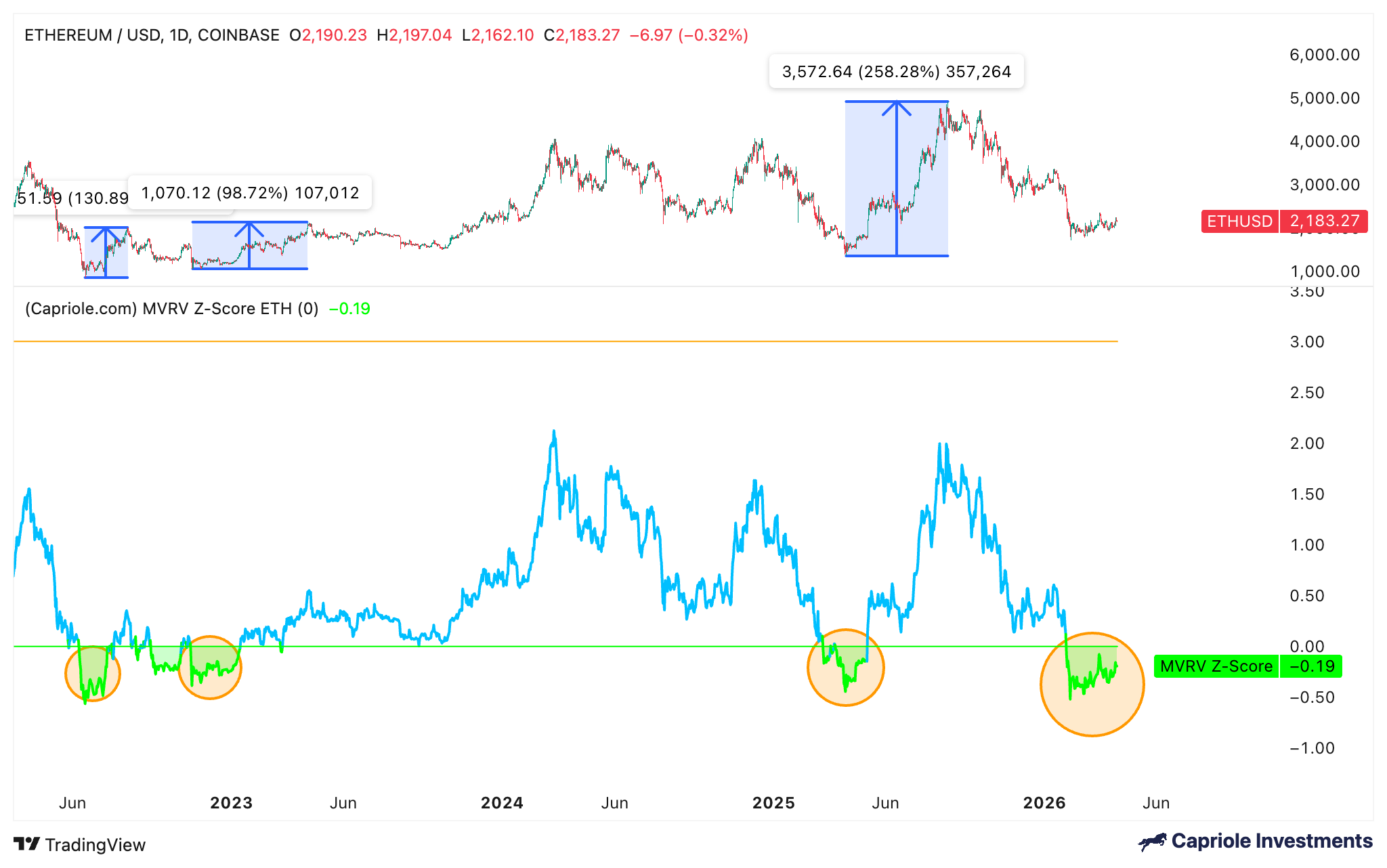 La última vez que el MVRV Z-score de Ether cayó a los niveles actuales fue en abril de 2025, después de una caída del precio del 66%. Esto coincidió con un mínimo macro del mercado en 1.400 dólares y precedió a un repunte de varios meses, con el par $ETH/USD subiendo un 258% hasta su actual máximo histórico de 4.950 dólares.