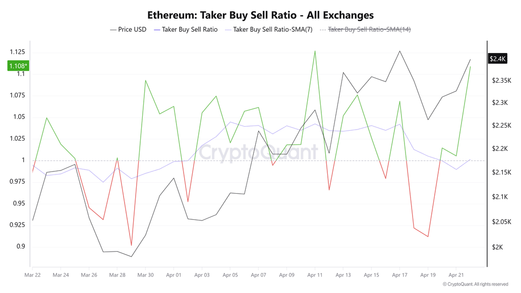 Un sentimiento similar es evidente en la Relación de Compra-Venta de Taker, que mide la diferencia entre los volúmenes de compra y venta de los operadores que usan órdenes de mercado en operaciones de swaps perpetuos. La métrica ha regresado al territorio alcista, indicando que el volumen de compra supera al de venta.