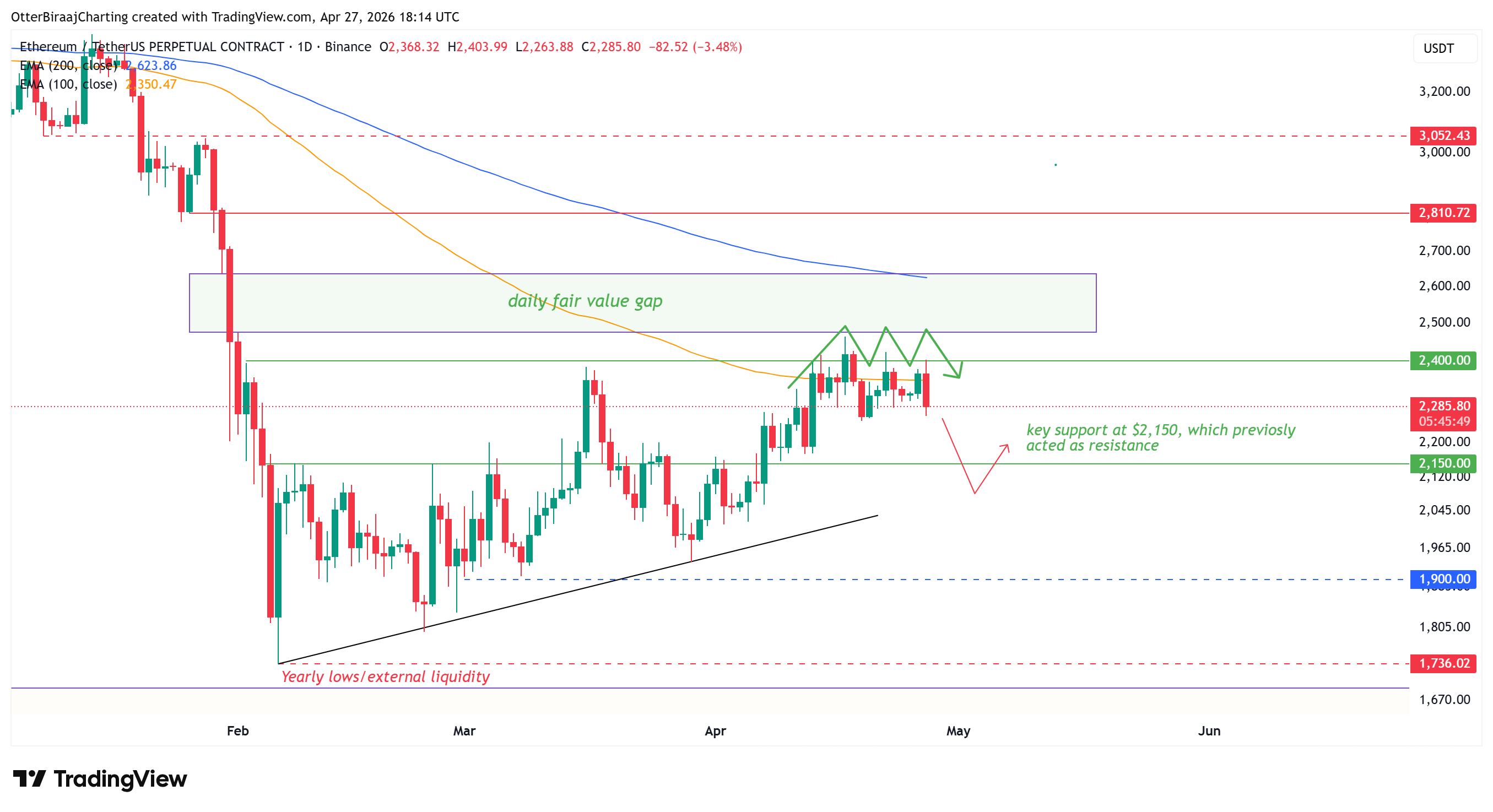 La media móvil exponencial (EMA) de 100 días, cercana a los 2.350 dólares, sigue actuando como una resistencia dinámica. El precio no se ha mantenido por encima de ella en el gráfico de un día, lo que hace que los intentos de alza sean efímeros.