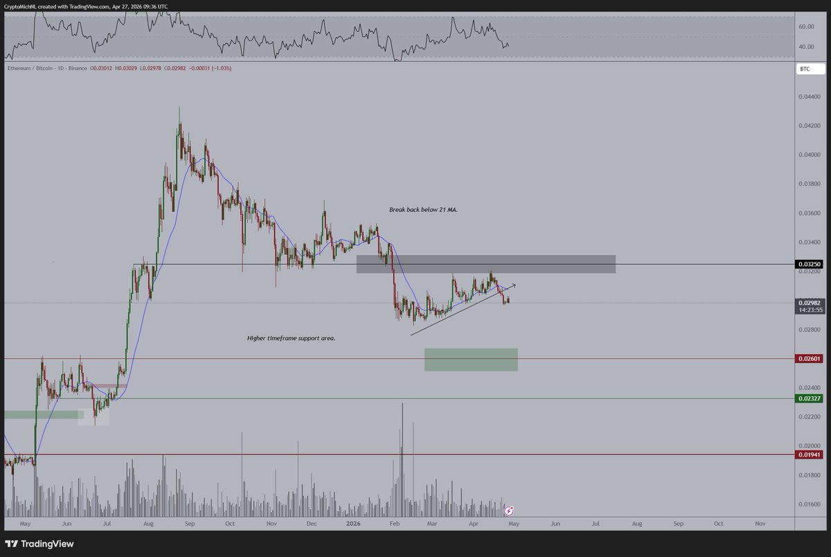 El fundador de MN Capital, Michaël van de Poppe, señaló debilidad en el par $ETH/$BTC. La relación cayó por debajo de 0,032 $BTC, eliminando un nivel de soporte clave vinculado a intentos de continuación anteriores.