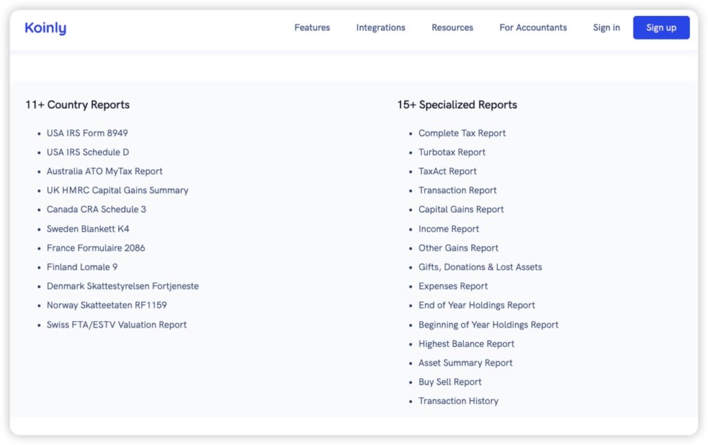 Las características clave de Koinly son: