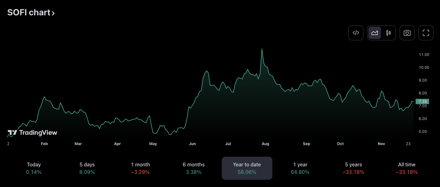 Las acciones de SoFi han visto cierta volatilidad en 2023, subiendo a USD 11.45 en julio después de comenzar el año a solo USD 4.5. Las acciones de SoFi han ido disminuyendo gradualmente desde entonces, cayendo por debajo de USD 7 a mediados de noviembre.