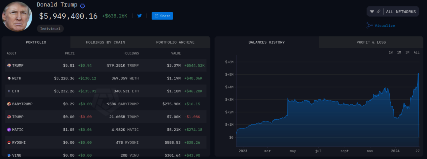 Arkham Intelligence estima el valor total de las criptomonedas de Trump en 5,94 millones de dólares. No se sabe si Trump decidirá vender su gran colección de tokens.