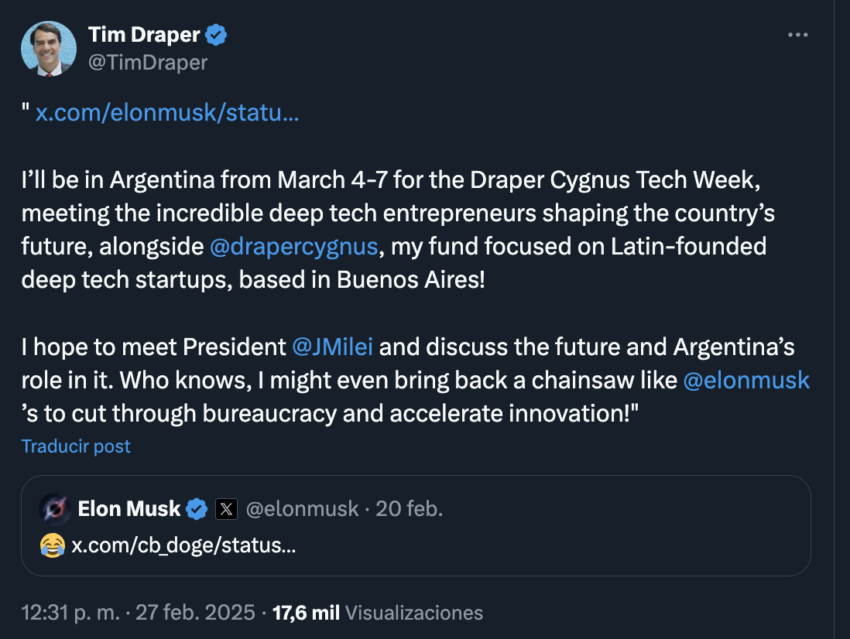 Tim Draper ha mostrado su optimismo por Argentina desde hace años. Incluso, señaló que El Salvador era un “buen modelo a seguir” para Argentina, tras señalar su confianza por Bitcoin por ser “descentralizado y confiable”. Además, sugería al país “confiar en sus emprendedores”, en especial las FinTechs o startups, además de las criptomonedas.