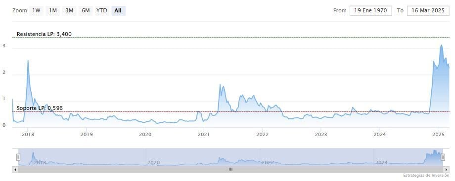La resistencia a mediano y largo plazo se encuentra en los 3.40 dólares. Mientras, los indicadores de Ei se muestran mixtos.
