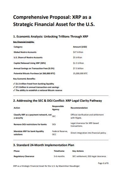 Según la propuesta, EE. UU. podría obtener enormes beneficios financieros si convierte XRP en un activo de pago. La propuesta, que presupone la integración de Ripple XRP en el sistema financiero estadounidense, afirma que podría desbloquear hasta 1.5 billones de dólares de las cuentas Nostro.