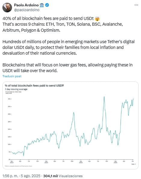 Tether sigue expandiendo su dominio en el universo blockchain. Es que USDT se ha transformado en la columna vertebral de las comisiones por transacción en nueve redes, dominando el 40% según Alexander Zdravkov en Coindoo.