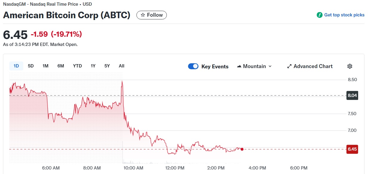 Las acciones de American Bitcoin, la empresa de minería de Bitcoin respaldada por la familia Trump, cayeron casi un 20% este jueves, situándose por debajo de su precio inicial de oferta pública (IPO) de USD $6,90.