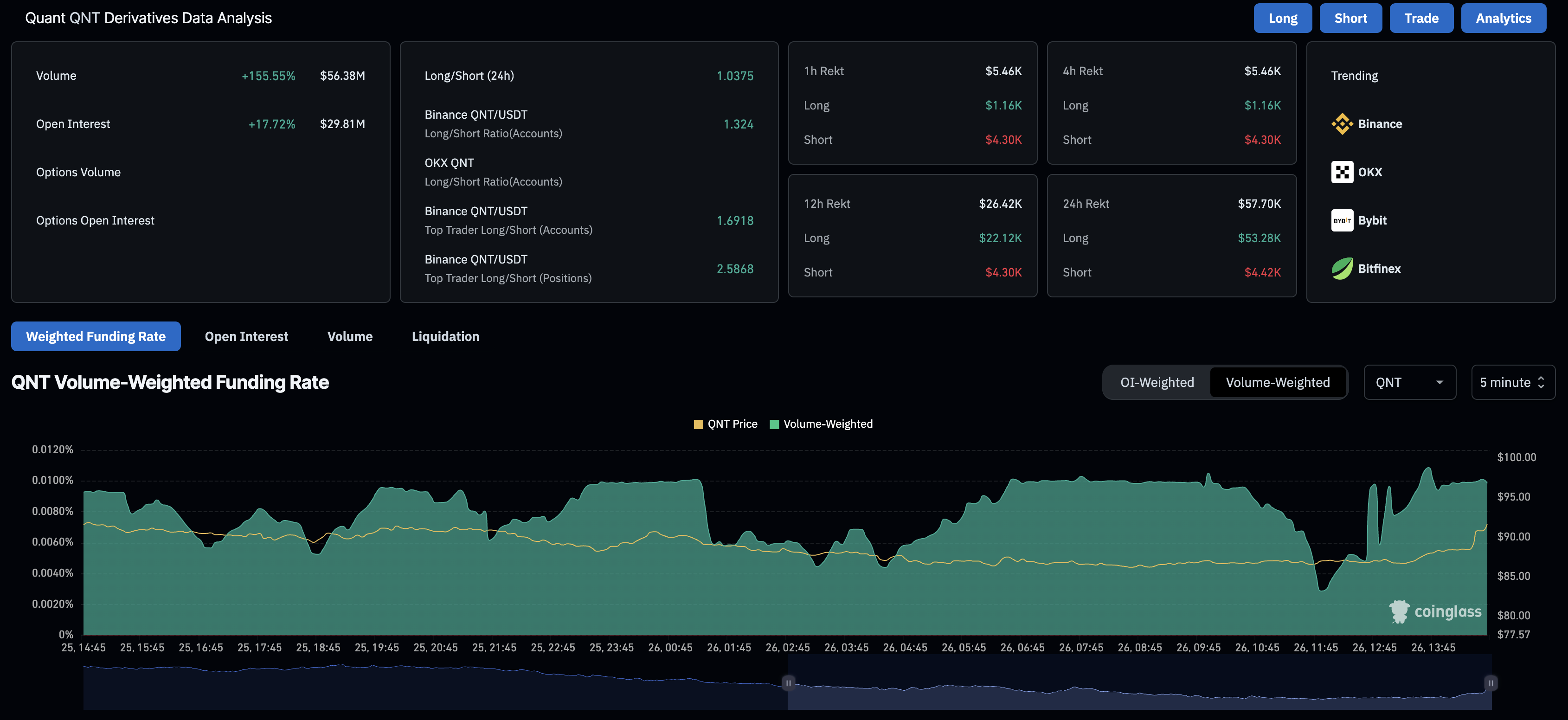 Los datos de CoinGlass muestran que el Interés Abierto (OI) de QNT ha aumentado un 17% en las últimas 24 horas, alcanzando los 29,81 millones de dólares. Típicamente, tales picos en el OI indican un sentimiento de riesgo entre los operadores.