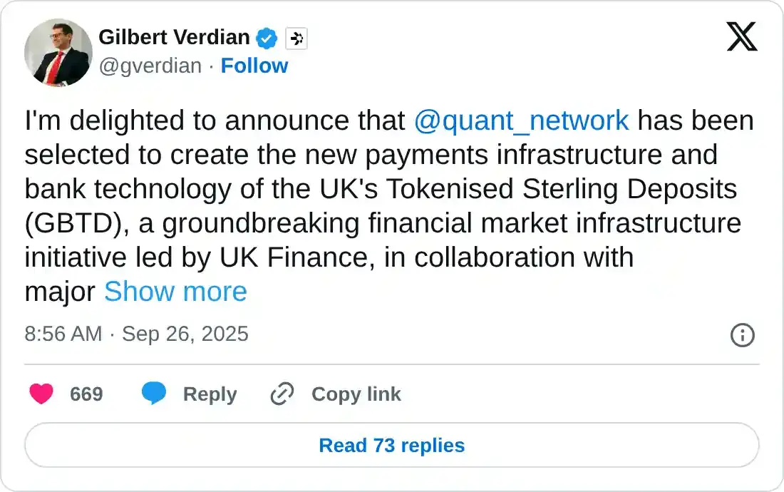 Gilbert Verdian, CEO de Quant Network, anunció en una publicación en X el viernes que Quant Network fue seleccionada para crear una infraestructura de pago digital y actualizar la tecnología bancaria para el proyecto de depósitos tokenizados en libras esterlinas (GBTD). La red Web 3.0 se asociará con bancos comerciales del Reino Unido, incluidos HSBC, Barclays, Lloyds, NatWest, Santander y Nationwide.