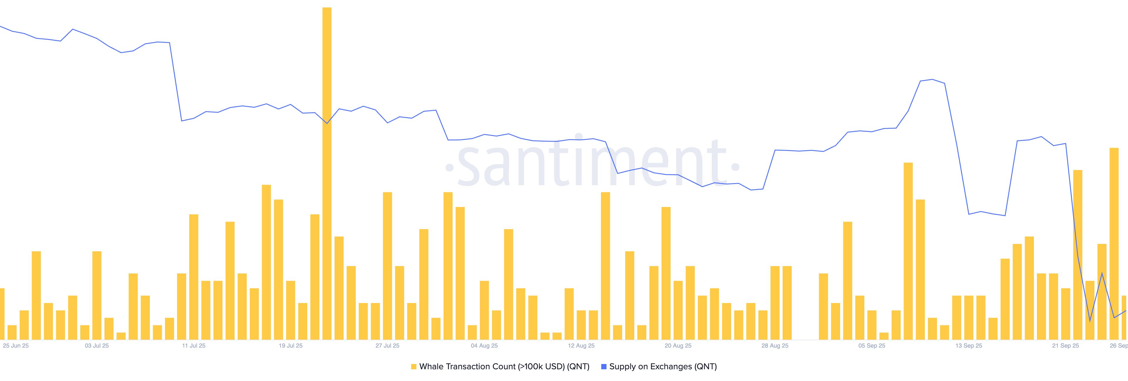 Los datos de Santiment muestran que las grandes transacciones de QNT, aquellas con un volumen superior a 100.000$, han aumentado significativamente esta semana, con 23 transacciones registradas el lunes y 26 transacciones el jueves. Esto indica un aumento del interés entre los inversores de grandes carteras, comúnmente conocidos como ballenas, pero no revela el sentimiento subyacente.