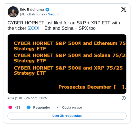El 26 de septiembre, el gestor de activos Cyber Hornet presentó documentos ante la Comisión de Bolsa y Valores de Estados Unidos (SEC) para tres fondos cotizados en bolsa (ETF) vinculados a criptomonedas. Cada fondo está diseñado para combinar exposición al índice S&P500 con Ethereum (ETH), Solana (SOL) y XRP.