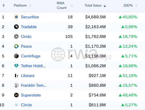 Actualmente, Ondo Finance posee una capitalización de mercado de 1.762 millones de dólares, lo que la consolida como el tercer mayor emisor mundial de bonos del Tesoro tokenizados.