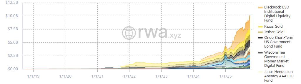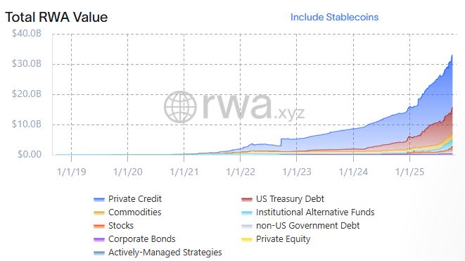 Una prueba del crecimiento de esta tendencia es que la capitalización de mercado de los RWA aumentó más del 100% en lo que va de 2025. Actualmente, es de 32.900 millones de dólares, tal como se observa en el siguiente gráfico: