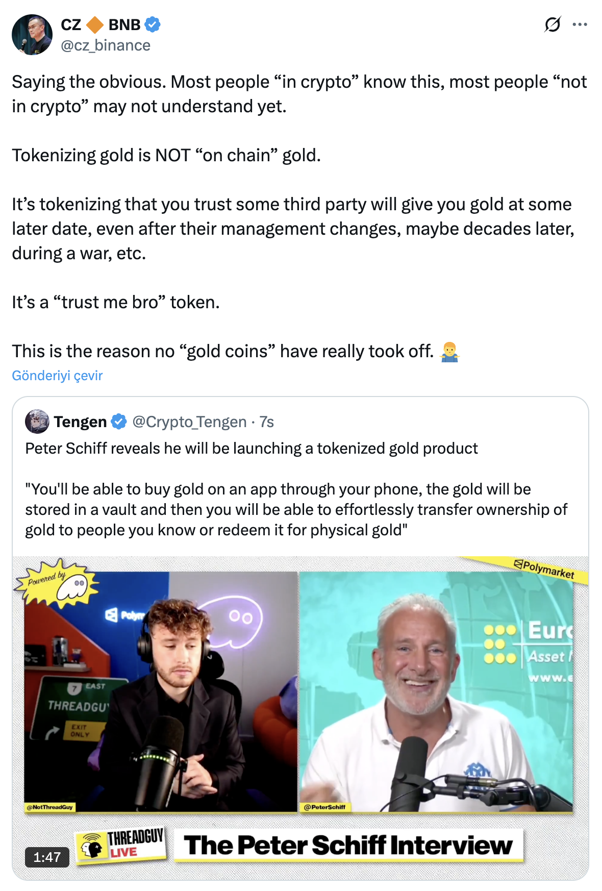 - Changpeng Zhao critica el oro tokenizado, llamándolo una inversión basada en confianza.