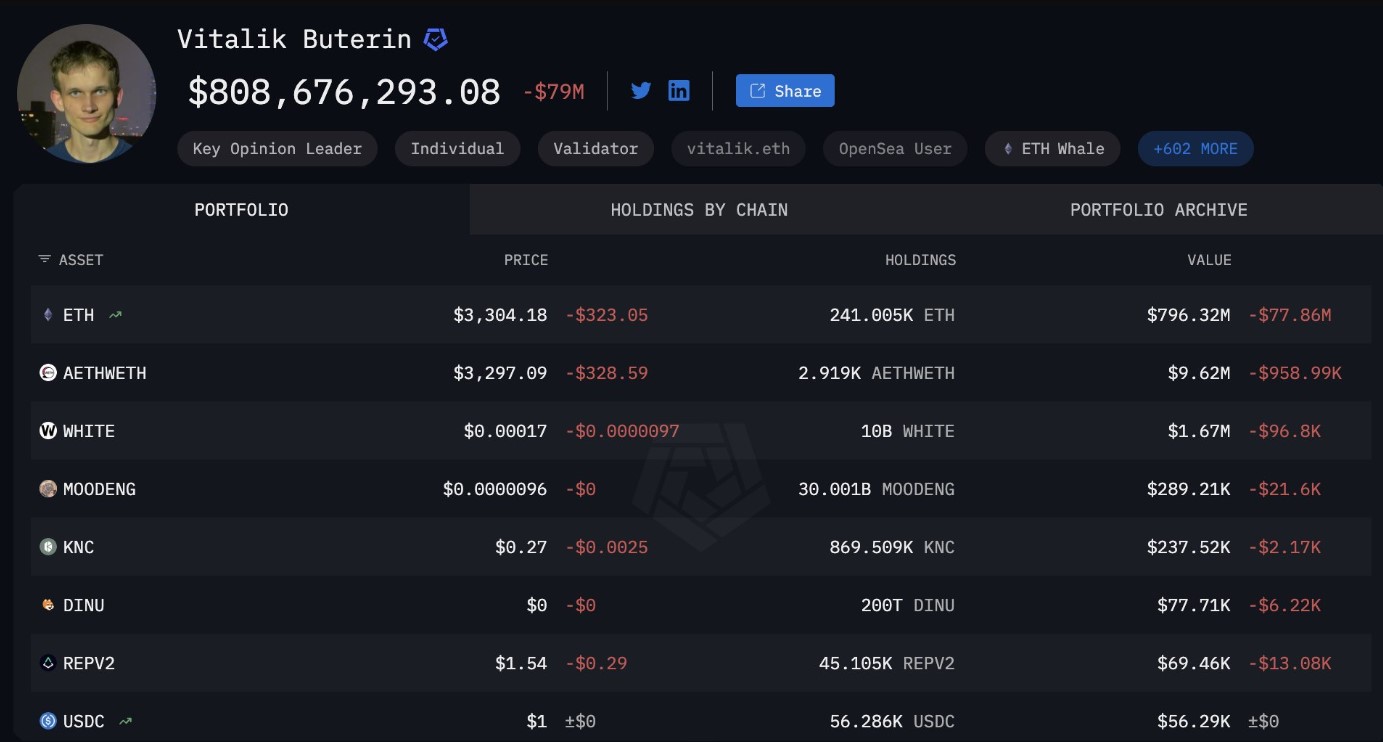 Buterin mantiene, además, tokens WHITE, MOODENG, KNC, DINU, REPV2 y USDC, tal como se aprecia a continuación: