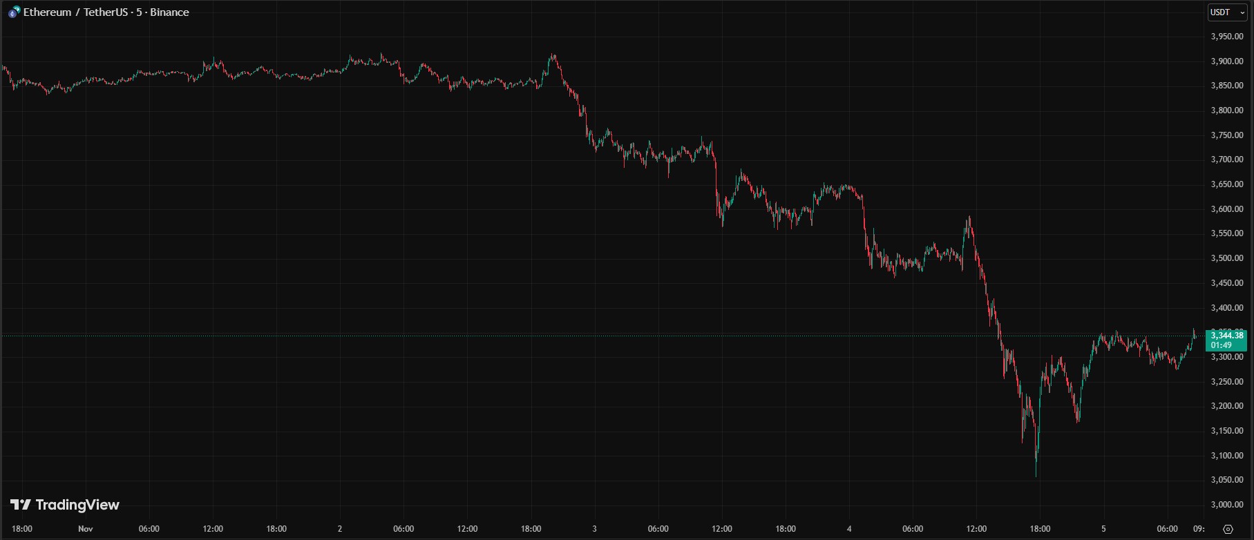 En el siguiente gráfico de TradingView puede observarse que el precio de ETH cayó desde la zona de los USD 3.900 hasta aproximarse a los USD 3.150 en un lapso de cinco días. Esto, antes de una leve recuperación hacia los USD 3.340 al momento de esta publicación.