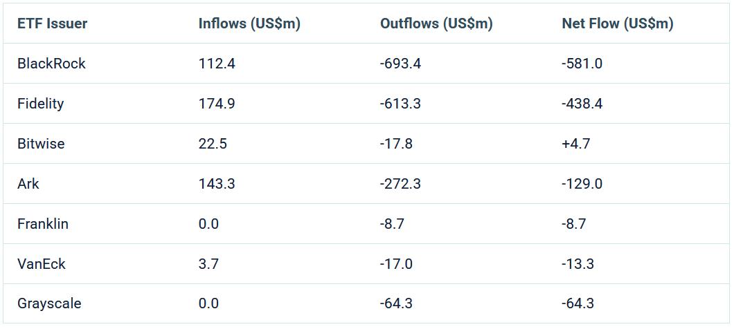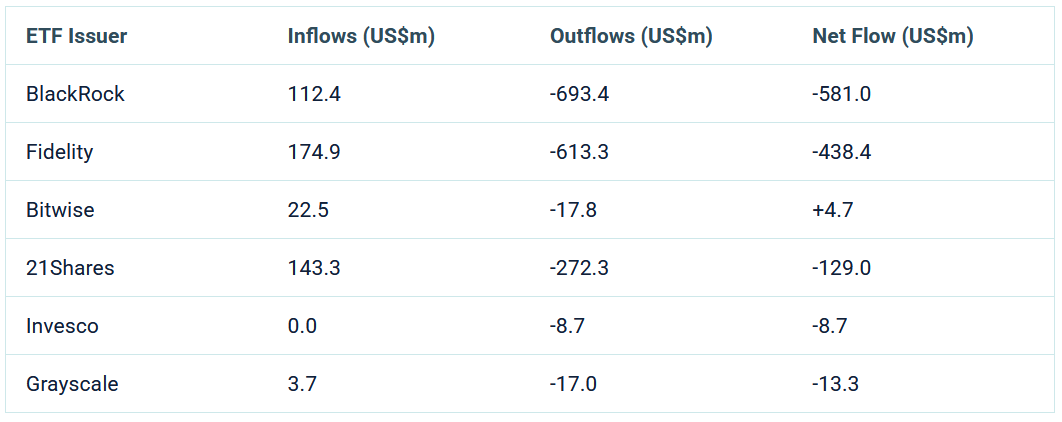 El fondo IBIT de BlackRock lideró los reembolsos de la semana, perdiendo casi 581 millones de dólares netos, incluyendo un destacado reembolso de 375 millones $ en un solo día el 4 de noviembre, tras entradas constantes en octubre. FBTC de Fidelity siguió con 438 millones en salidas netas, mientras que Ark Invest vio 129 millones retirados de su producto de Bitcoin.