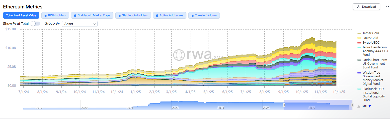 Los activos tokenizados Ethereum son diversos y han crecido en todas las categorías. La mayor parte del crecimiento se produjo en 2025, con importantes entradas de capital provenientes de múltiples fondos del mercado monetario con sede en EE. UU. Ethereum busca posicionarse como la cadena de referencia para la tokenización de activos debido a su seguridad y la adopción de tecnologías heredadas.