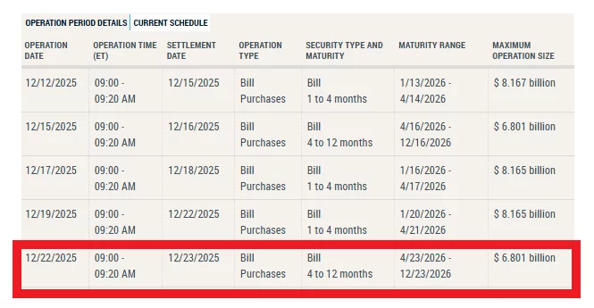 La Reserva Federal está preparada para inyectar $6.8 mil millones en el sistema financiero el 22 de diciembre de 2025, para aliviar las restricciones de liquidez de fin de año. Esta operación, realizada a través del mecanismo repo, marca la inyección repo más sustancial desde 2020. En el mercado de criptomonedas, tal afluencia de liquidez podría potencialmente aumentar el apetito por el riesgo y el sentimiento del mercado. Además, la adición acumulada de $38 mil millones en liquidez durante los últimos diez días ha cimentado aún más las expectativas de un entorno de inversión más favorable.
