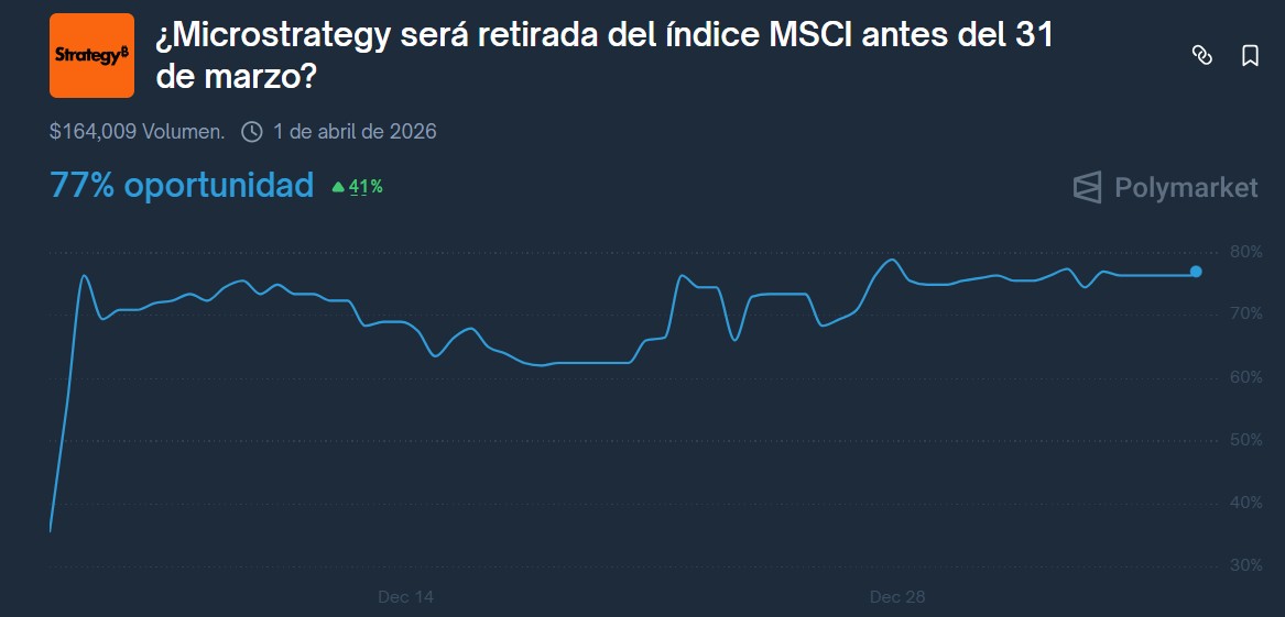 Esta proyección se fundamenta en los datos del mercado de predicción Polymarket, donde los participantes asignan un 77% de probabilidad a que la firma será eliminada de este indicador de referencia para inversores institucionales, como se aprecia en la siguiente imagen.