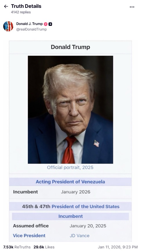 Mientras tanto, en un giro inesperado, Donald Trump se autodenominó presidente interino de Venezuela en una publicación en su red social Truth Social el lunes por la mañana. Compartió una imagen de una página de Wikipedia que lo lista como el actual presidente de EE.UU. desde enero de 2025, utilizando el mismo retrato oficial. La entrada ha recibido más de 29.000 reacciones de “me gusta”.