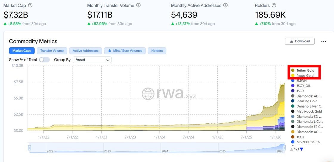 Más allá del oro, la capitalización total de $7.320 millones incluye una creciente cola larga de activos tokenizados como plata y acciones, que comienzan a replicar patrones similares de adopción.