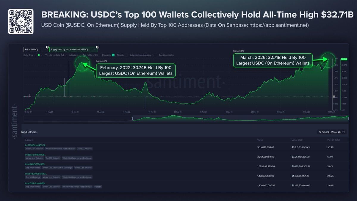 USD Coin es una de las monedas estables más importantes del mercado y cuenta con el beneplácito de las entidades gubernamentales. Por ello, las 100 billeteras de $USDC más ricas de la red Ethereum han alcanzado una cifra récord de 32.710 millones de dólares. Su mayor nivel de concentración desde 2022, según Toheeb Kolade en ETH News.