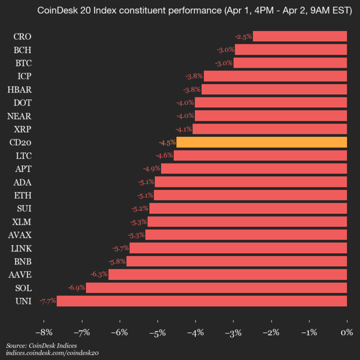 El CoinDesk 20 se cotiza actualmente en 1875.68, con una caída del 4.5% (-88.38) desde las 4 p.m. ET del miércoles.