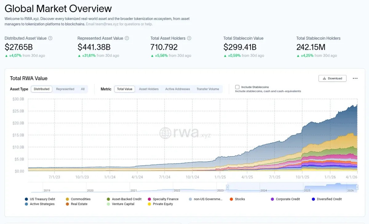 Lejos de ser una simple promesa a futuro, este sector ya es un ecosistema maduro y en plena expansión. A finales de 2025, el valor total de los activos del mundo real tokenizados en cadena (excluyendo las stablecoins) superó los 27.650 millones de dólares, lo que representa un crecimiento asombroso de más del 2.200% desde el año 2020. Este mercado está liderado principalmente por el crédito privado, que abarca más del 52% del sector, seguido de cerca por los valores tokenizados como los bonos del Tesoro de Estados Unidos.