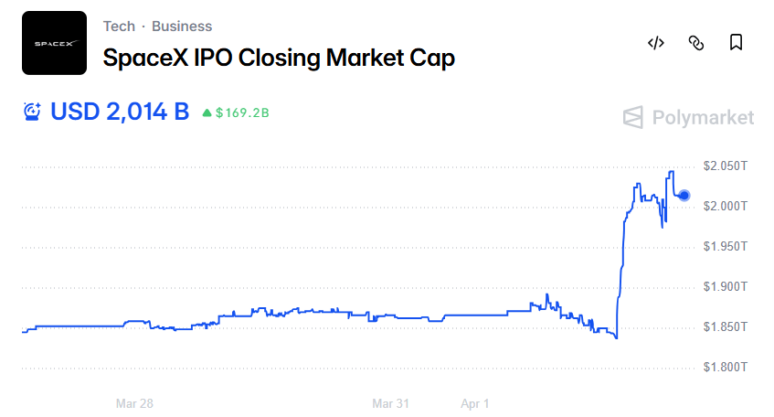 Los inversores especulativos no han esperado a que los documentos oficiales vean la luz. En Polymarket, el contrato sobre la capitalización de cierre del primer día de cotización de SpaceX asigna una probabilidad del 44% a que la empresa termine su primera jornada bursátil valuada entre $1.5 y $2 billones.