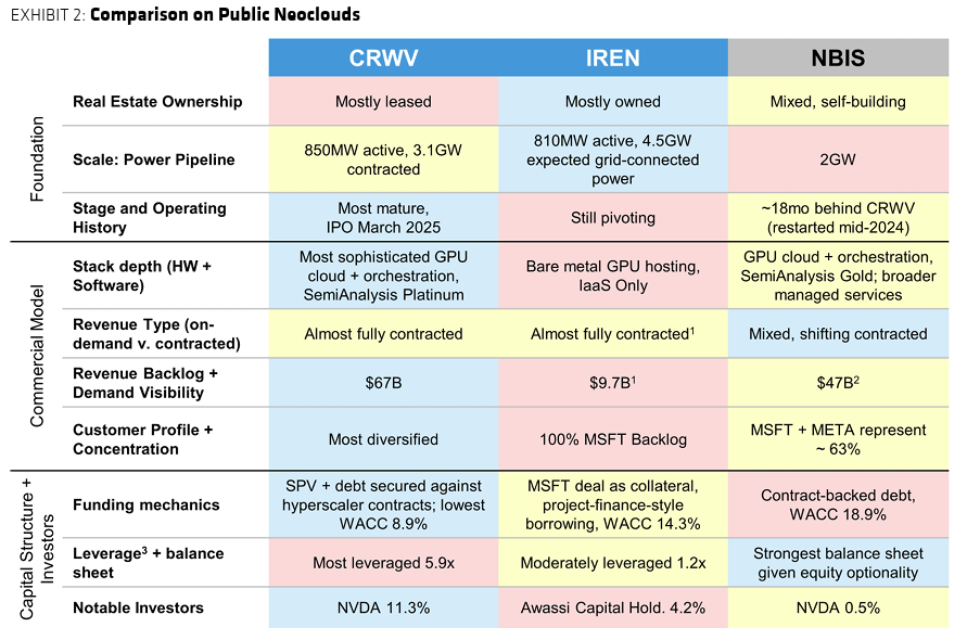 El informe comparó a CoreWeave con sus pares IREN y Nebius, destacando las diferencias en escala, infraestructura y estrategias de financiación.
