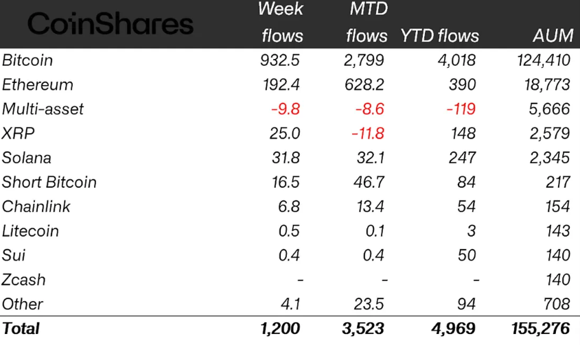 Los productos cotizados en bolsa (ETPs) de criptomonedas registraron 1.200 millones de dólares en entradas la semana pasada, marcando su cuarta semana consecutiva de ganancias, según informó CoinShares el lunes.