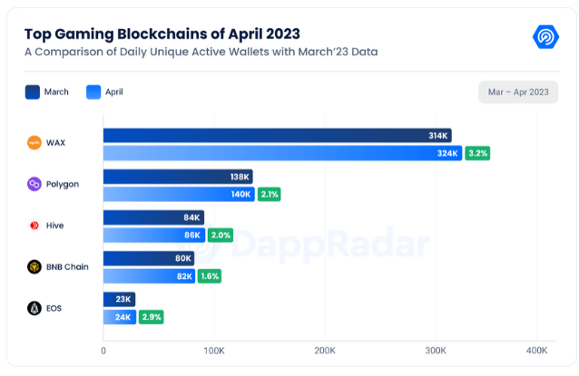 En cuanto a las cadenas de juego más populares, WAX sigue liderando con más de 320,000 UAW diarios en abril. Polygon se ha convertido recientemente en la segunda cadena de juegos más grande en términos de UAW diarios, con más de 140,000 usuarios en abril.