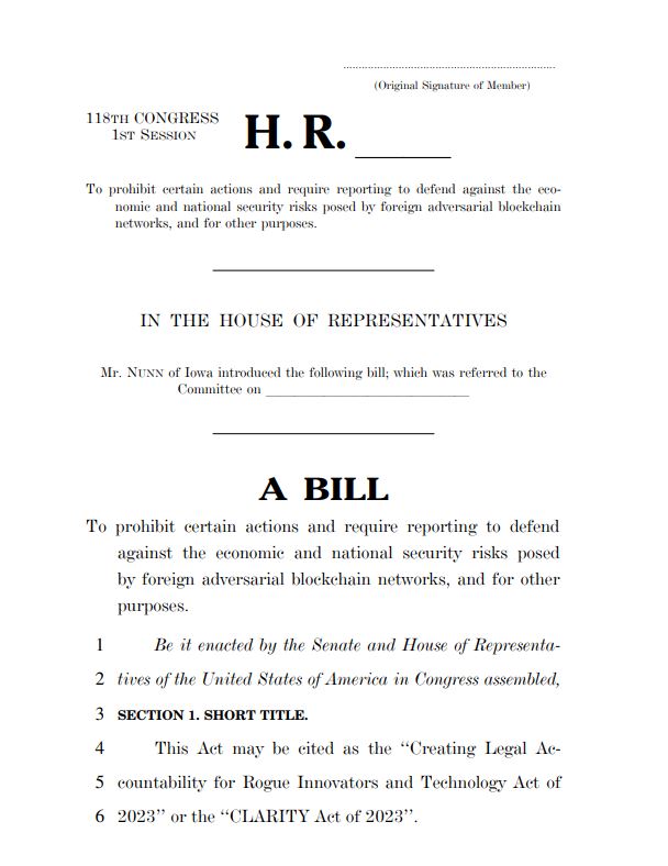 Los representantes de los Estados Unidos, Zach Nunn y Abigail Spanberger, han presentado conjuntamente la Ley de Creación de Responsabilidad Legal para Innovadores y Tecnología deshonestos de 2023, o la Ley CLARITY de 2023. La legislación tiene como objetivo prohibir a los funcionarios del gobierno federal realizar negocios con empresas chinas de blockchain.