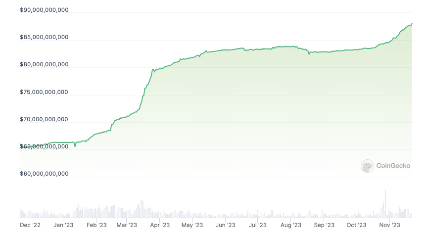 La stablecoin Tether ($USDT) ha ido ganando impulso en el mercado y se acerca a una capitalización de mercado de USD 90,000 millones, según datos de CoinGecko. El 20 de noviembre, el valor de $USDT alcanzó otro nuevo máximo con USD 88,000 millones, un 33% más desde principios de 2023.
