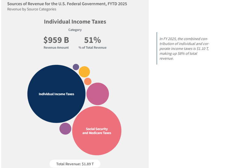 Los impuestos sobre la renta individuales son, con mucho, la mayor fuente de ingresos para el gobierno de los Estados Unidos. A partir del año fiscal 2025, los estadounidenses han pagado $ 959 mil millones en impuestos sobre la renta, lo que representa el 51% de los ingresos federales totales, según lo informado por el Departamento del Tesoro.