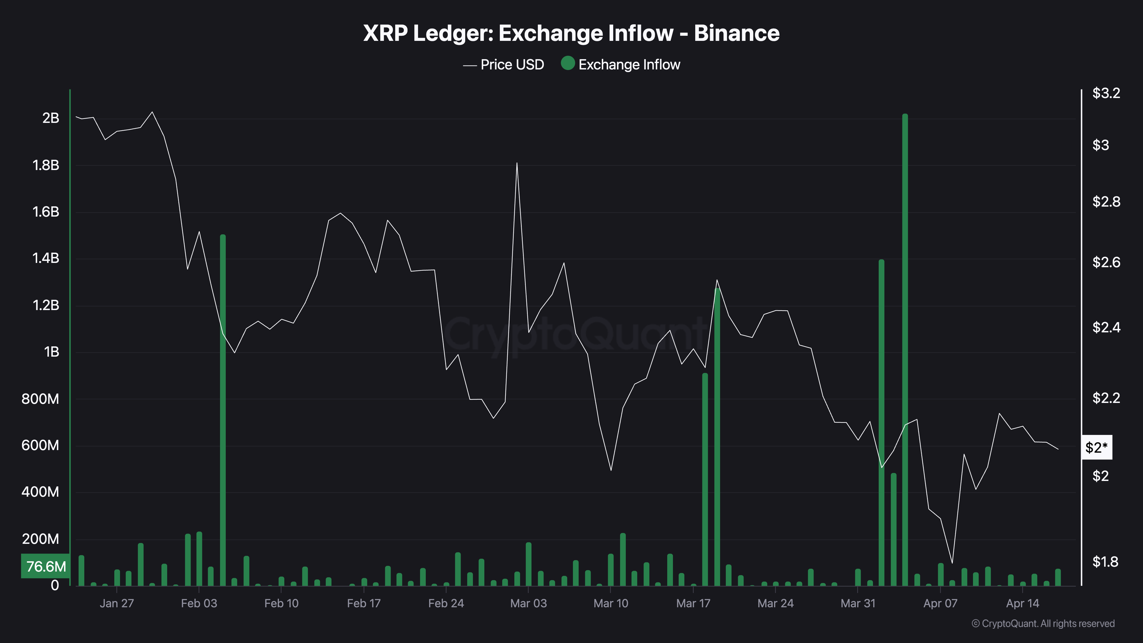Los datos de CryptoQuant revelan una caída significativa en el volumen de entrada de XRP en los exchanges. Según el gráfico a continuación, las entradas de XRP en los exchanges han caído un 96% de más de 2 mil millones el 4 de abril a aproximadamente 77 millones de XRP el jueves. La disminución de las entradas en los exchanges reduce significativamente la presión de venta potencial. Muestran que los inversores están dispuestos a mantener sus tokens, anticipando precios más altos.