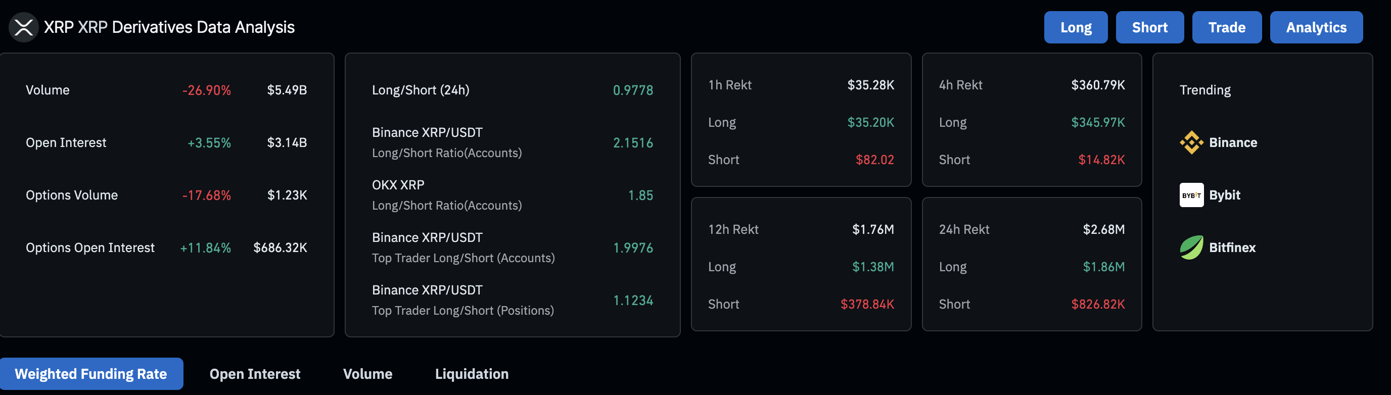 Mientras tanto, un aumento del 3.55% en el interés abierto de los derivados a 3.14 mil millones de dólares, según datos de CoinGlass, sugiere un sentimiento mejorado en torno a XRP. En otras palabras, los traders están dispuestos a apostar por niveles de precios más altos a corto plazo.