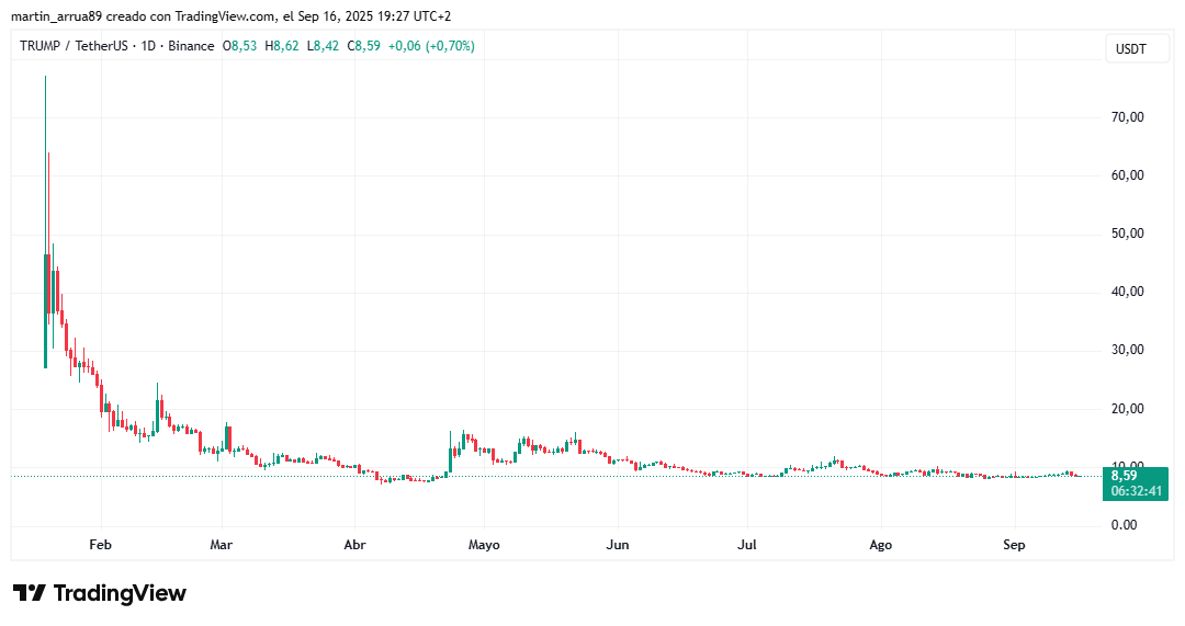 El día posterior a su lanzamiento, el activo alcanzó un máximo histórico (ATH) de 75,35 dólares. Sin embargo, tras la asunción presidencial, el precio se desplomó y actualmente se negocia en 8,61 dólares, tal como se observa en el siguiente gráfico provisto por TradingView: