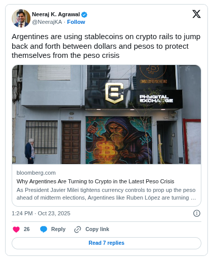 “Las stablecoins son ahora clave para que los argentinos se protejan de la crisis del peso, ilustrando un poderoso caso de uso para la defensa financiera autosoberana”, afirmó.