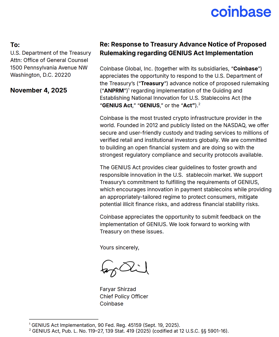 La bolsa de criptomonedas basada en EE.UU., Coinbase, enfatizó que las regulaciones preparadas bajo la Ley GENIUS, que entró en vigor en julio, deben adherirse estrictamente al marco establecido por el Congreso. La empresa advirtió que si el Departamento del Tesoro impone obligaciones más amplias de lo anticipado por la ley, la innovación podría verse obstaculizada, potencialmente debilitando el objetivo de los EE.UU. de liderazgo global en criptomonedas.