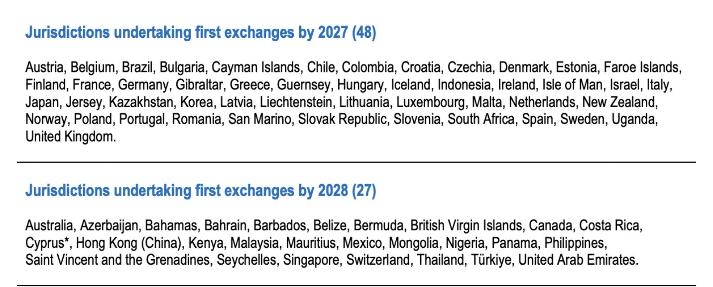 El primer grupo de 48 jurisdicciones comenzará a recopilar datos en 2026 para los intercambios que comiencen en 2027. Sin embargo, se espera que otros 27 países, incluidos Australia, Canadá, México, Suiza y Hong Kong, comiencen a informar en 2028.