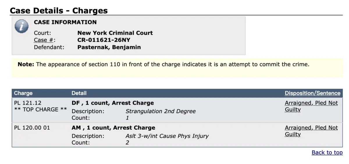 Pasternak fue detenido el martes 22 de abril de 2026. Se le acusa de un cargo de estrangulamiento en segundo grado, un delito grave, y de dos cargos de agresión en tercer grado, delitos menores, con intención de causar lesiones corporales. Se declaró inocente y se le concedió la libertad bajo fianza, a pesar de que la fiscalía exigía una fianza de 30 000 dólares.