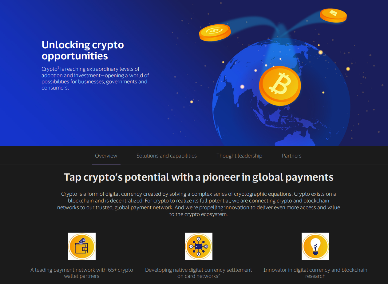 La multinacional Visa, uno de los procesadores de pagos más grandes del mundo, está conectando las redes de criptomonedas y blockchain a su red de pagos global. La compañía que introdujo el dinero de plástico en el mundo, asegura en su web que cripto está alcanzando niveles extraordinarios de adopción e inversión, abriendo un mundo de posibilidades para empresas, gobiernos y consumidores. La compañía tiene en su web principal un portal totalmente dedicado a las criptomonedas, subrayando de esta forma la importancia que concede a los criptoactivos en la transformación de las finanzas y los pagos globales.