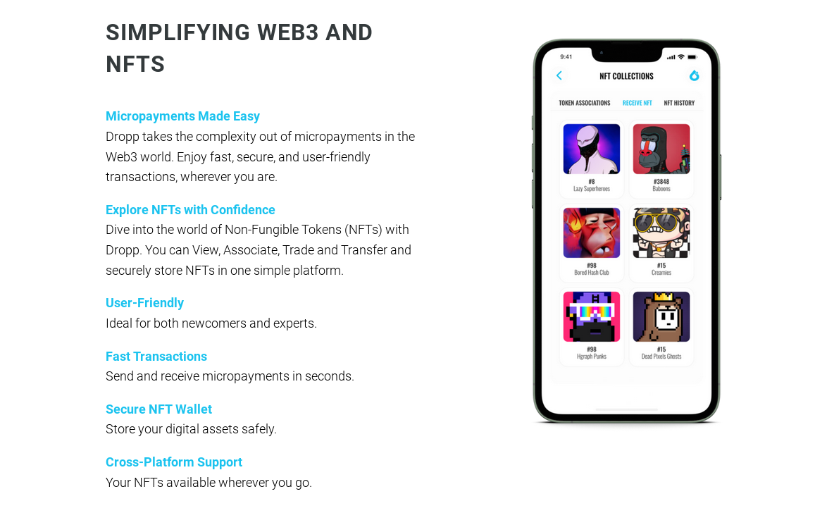 Por ejemplo, Dropp permite acceder a servicios Web3, como mercados NFTs, exchanges o aplicaciones descentralizadas, gracias a su capacidad de micropagos utilizando múltiples monedas. Entre las opciones de monedas figuran: USD (Dólar por medio de FedNow), AED (Dirham moneda oficial de EAU o Emiratos Árabes Unidos), Hedera (HBAR), USDC (de Ethereum, Polygon, Avalanche y Hedera). De esta manera, Dropp permite a manejar pagos con múltiples monedas, ajustándose a la operativa de los usuarios de la aplicación.