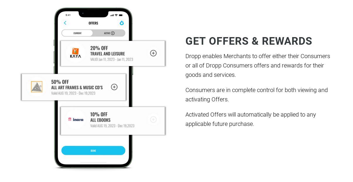 Dropp es una plataforma de transacciones del tipo «pago por uso». Es decir, Dropp ofrece a sus usuarios la posibilidad de acceder y consumir un producto de acuerdo con sus necesidades y pagar únicamente por lo que usa. De esta manera se evita tener que comprar un activo y pagar por su gestión o mantenimiento. La aplicación en sí misma está diseñada para facilitar a los consumidores la compra segura de bienes y servicios de pequeño valor sin necesidad de registrarse.