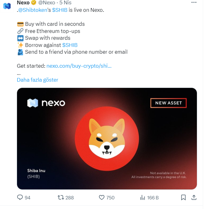 La firma de servicios financieros basada en criptoactivos Nexo anunció el 5 de abril que oficialmente listó el token nativo de Shiba Inu, $SHIB, en su plataforma. La compañía, que anunció este emocionante desarrollo, informó a la comunidad cripto que $SHIB ya está disponible para operar en Nexo.