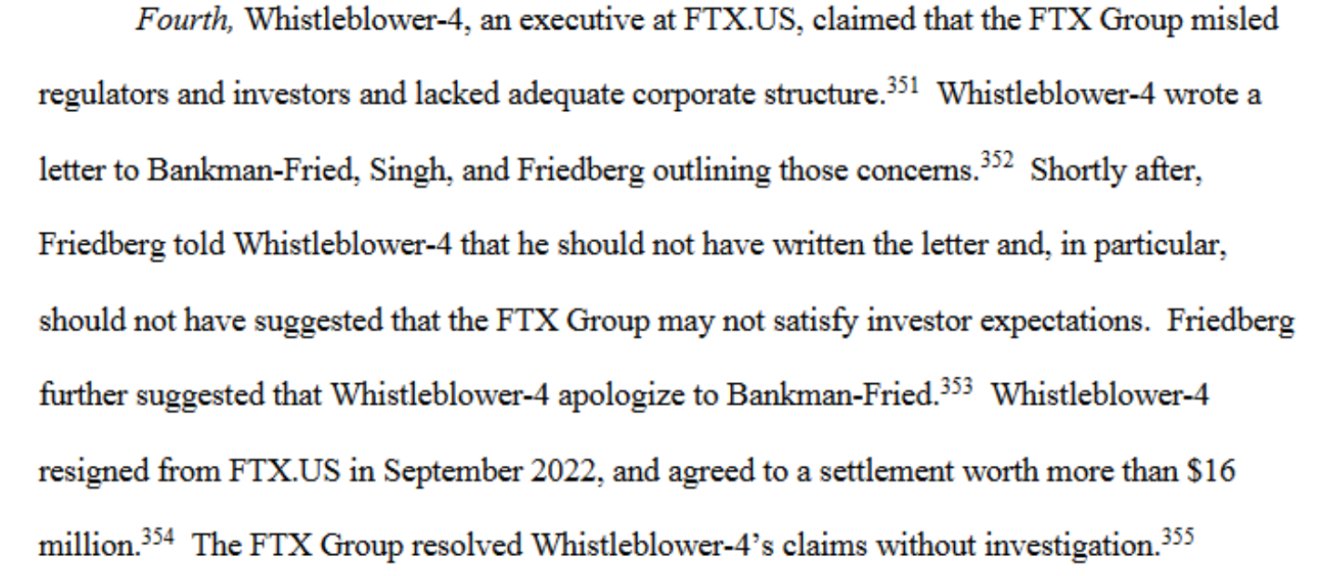 Asimismo, el denunciante anónimo indicó que renunció posteriormente en septiembre del 2022 y acordó un acuerdo con FTX por un valor de más de $16 millones de dólares.