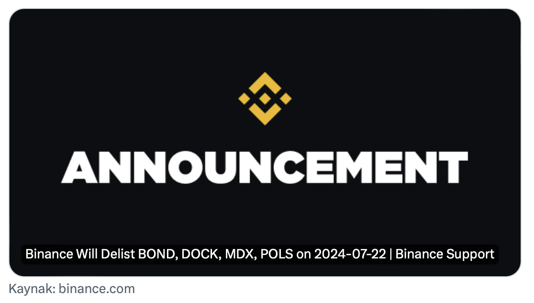 Uno de los principales intercambios de criptomonedas del mundo, Binance, anunció que eliminará BarnBridge (BOND), Dock (DOCK), Mdex (MDX) y Polkastarter (POLS). El intercambio de criptomonedas comenzará el proceso de eliminación el 22 de julio de 2024.